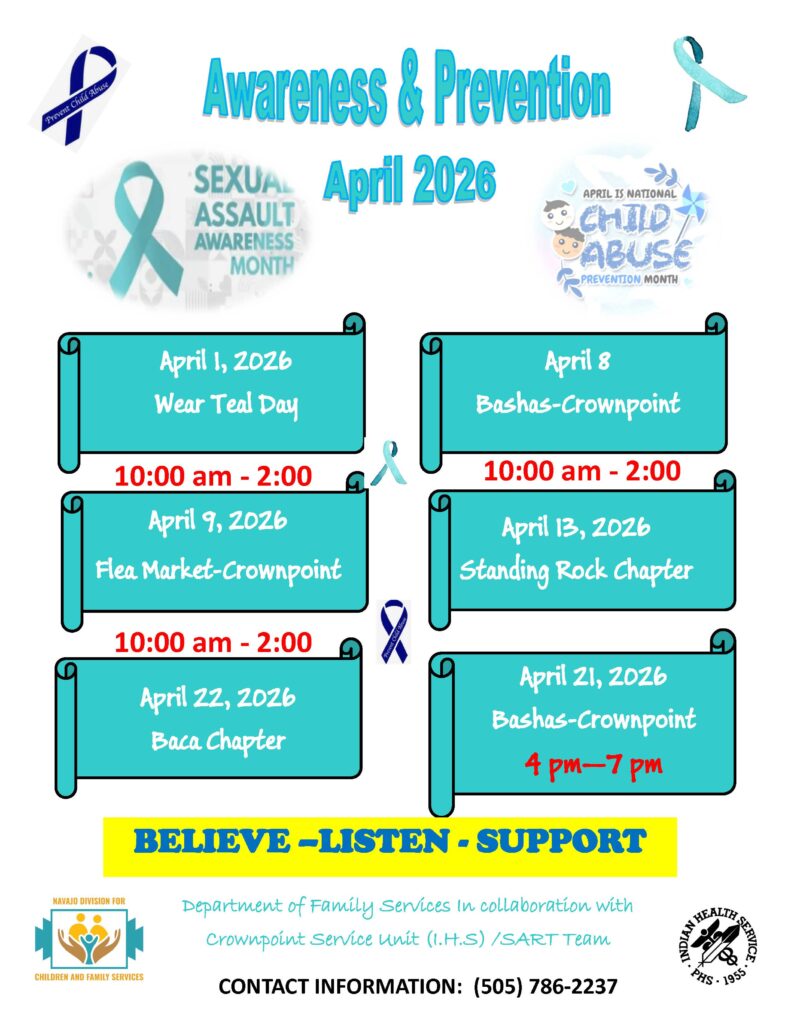 The DFS Crownpoint Field Office will participate in awareness and prevention activities for Sexual Assault Awareness Month and Child Abuse Prevention Month. See the schedule on the flyer for more information on dates and locations. For more information, contact (505) 786-2237.