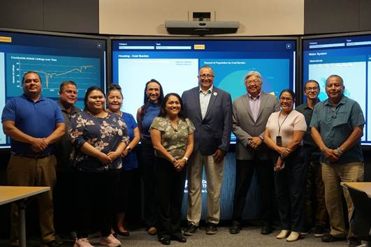 One of the visions for the Decision Theater is that it can assist in the work of the Diné Action Plan (DAP) to defeat the four modern-day monsters of suicide, violence, substance abuse, and missing and murdered Diné relatives. Sonlatsa Jim, NDCFS Deputy Director, explained the DAP during the onsite visit. One major element of the DAP is that it has a data workgroup, led by the Navajo Epidemiology Center, which gathers data related to the four modern-day monsters.