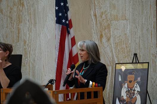Indian Affairs Department Cabinet Secretary Josett Monette reads the American Indian Day Proclamation.