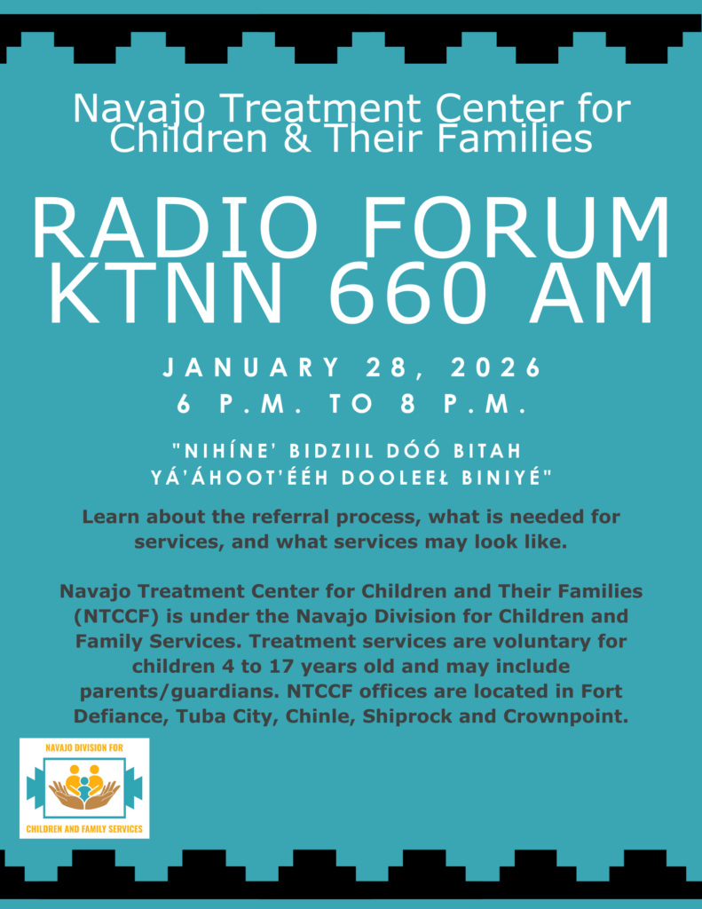 • Please join the Navajo Treatment Center for Children and Their Families for the radio forum on KTNN 660 AM on January 28, 2026, from 6 p.m. to 8 p.m. Learn about the referral process, what is needed for services, and what services may look like.