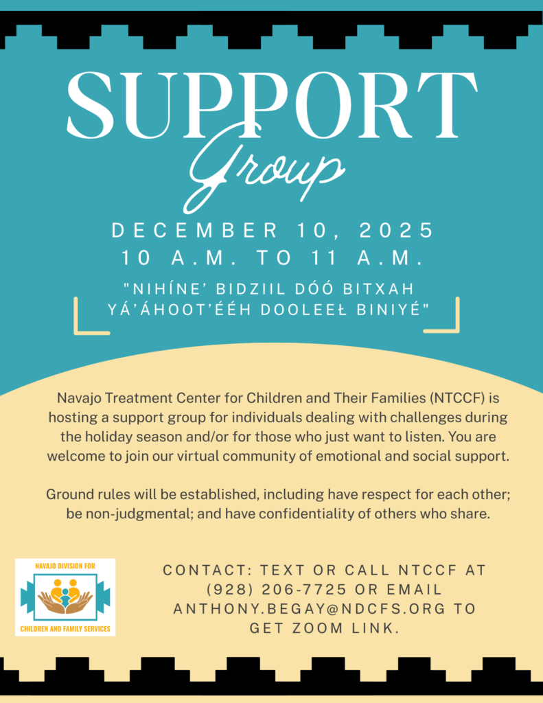 Navajo Treatment Center for Children and Their Families (NTCCF) is hosting a support group for individuals dealing with challenges during the holiday season and/or those who just want to listen. You are welcome to join our virtual community of emotional and social support on December 10, 2025.