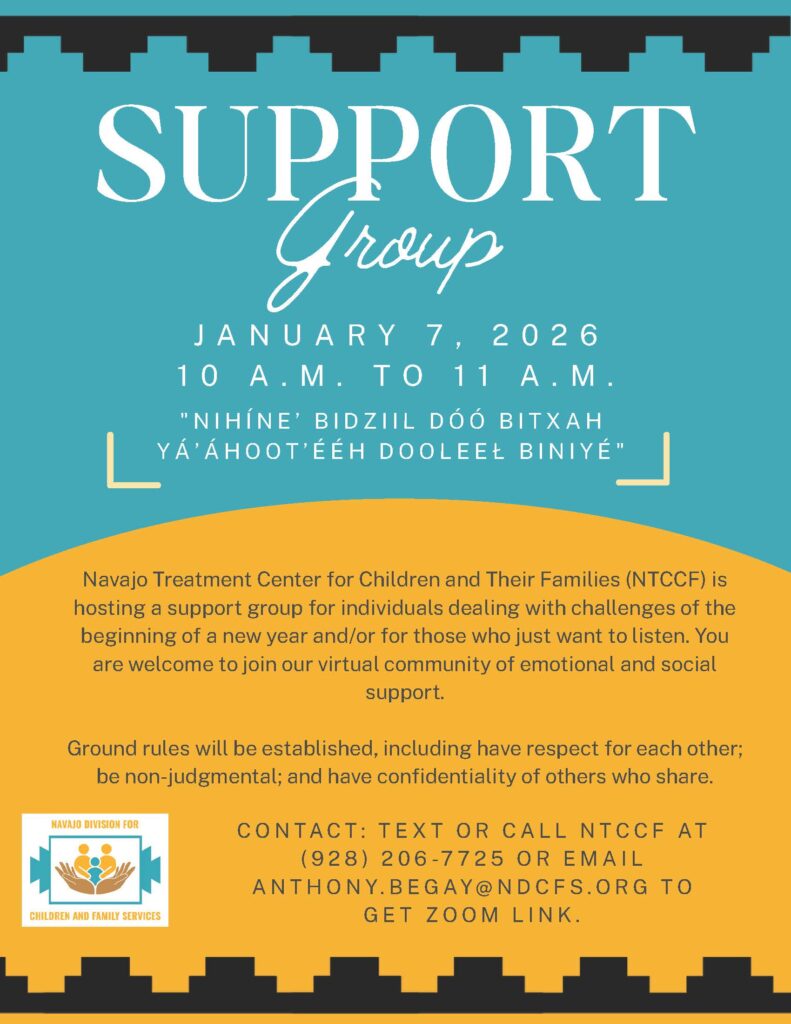 Navajo Treatment Center for Children and Their Families (NTCCF) is hosting a support group on January 7, 2026, for individuals dealing with challenges of the beginning of a new year and/or for those who just want to listen. You are welcome to join our virtual community of emotional and social support.